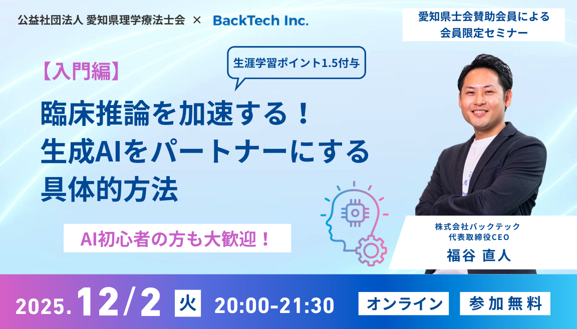 本愛知県士会承認研修会では、株式会社バックテックの福谷直人氏が講師となり、「生成AI時代における臨床推論の新しいアプローチ」を解説します。AIを「ツール」ではなく「思考のパートナー」として活用することで、理学療法士の臨床推論プロセスを飛躍的に効率化する方法をお伝えします。